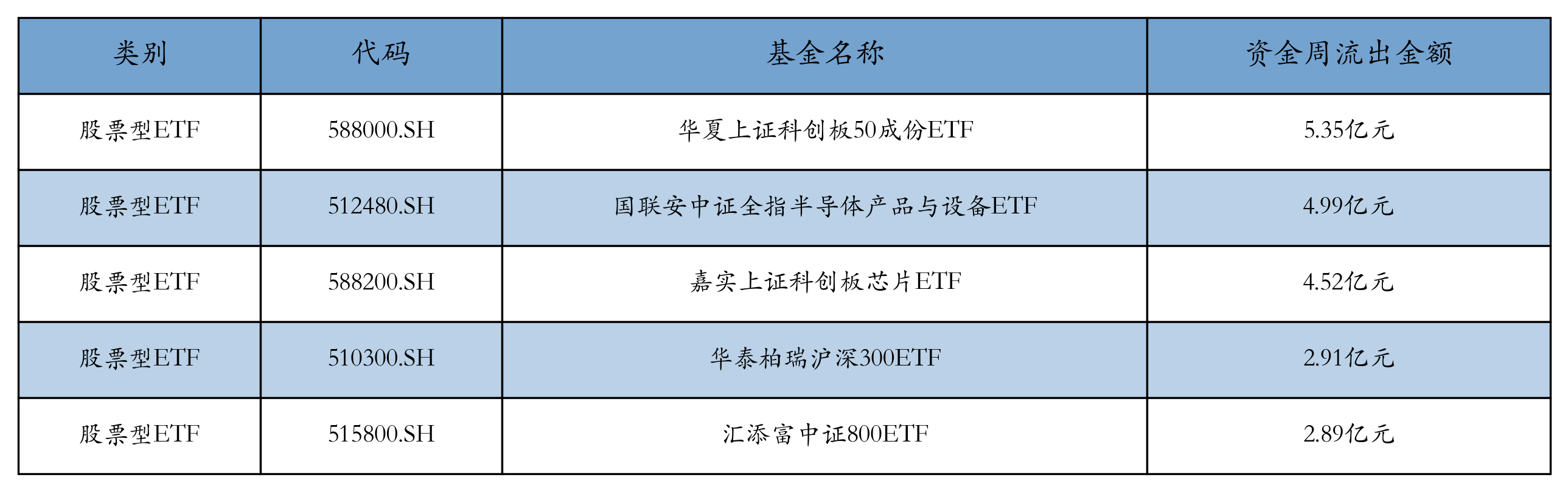 上周股票型ETF资金流出最多的5支ETF偏激流入金额永诀为:中原上证科创板50成份ETF(流出5.35亿元)、国联安中证全指半导体居品与开采ETF(流出4.99亿元)、嘉实上证科创板芯片ETF(流出4.52亿元)、华泰柏瑞沪深300ETF(流出2.91亿元)、汇添富中证800ETF(流出2.89亿元)。细目见下表: